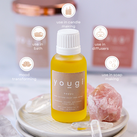 Lift your senses with the Happy Diffuser. This deeply uplifting and invigorating product is a blend of therapeutic-grade essential oils. The aromatic mixture of bergamot, orange, lemongrass, and ylang-ylang essential oil helps to soothe and encourage positivity. View the full Happy Essential Oil range.